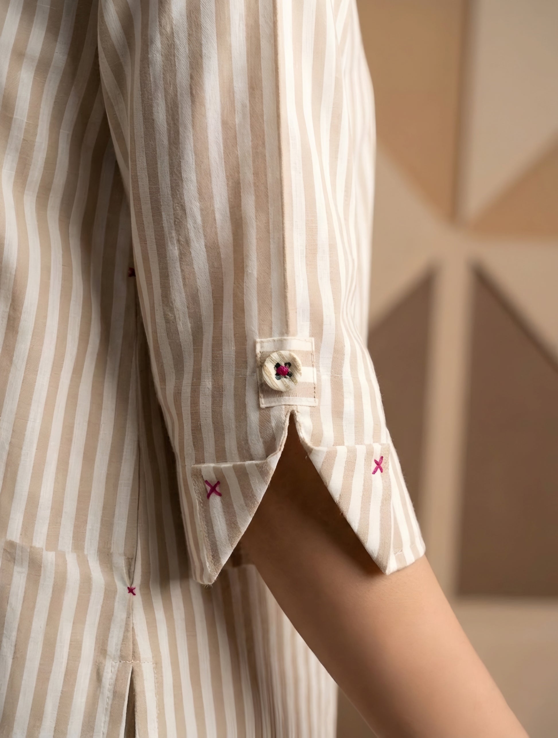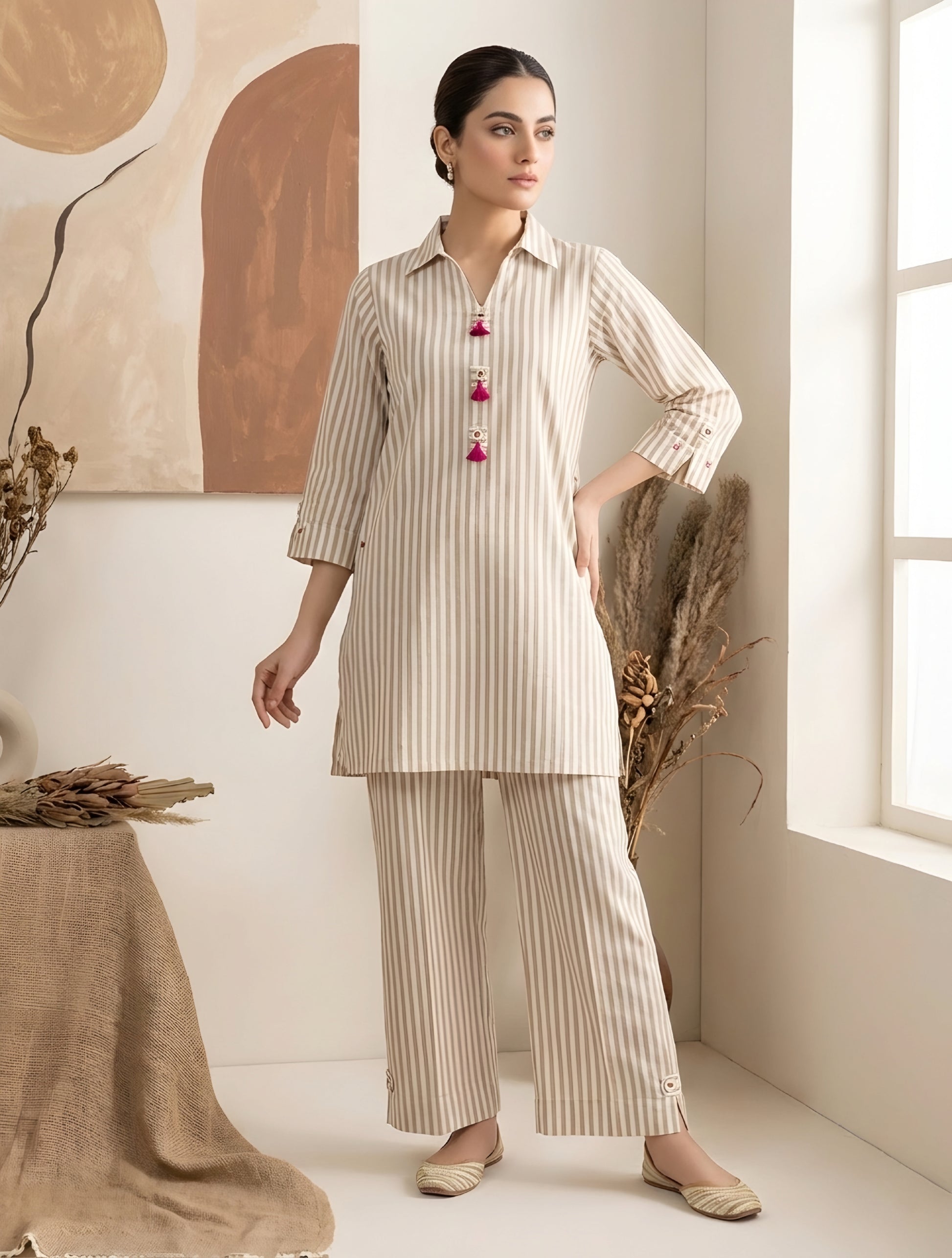 2 pieces co-ord set. Soft Cotton Fabric. Having 3 quarter sleeves . Wide Straight pants. Thigh length shirt. Button details. Having Side pockets on the shirt.
