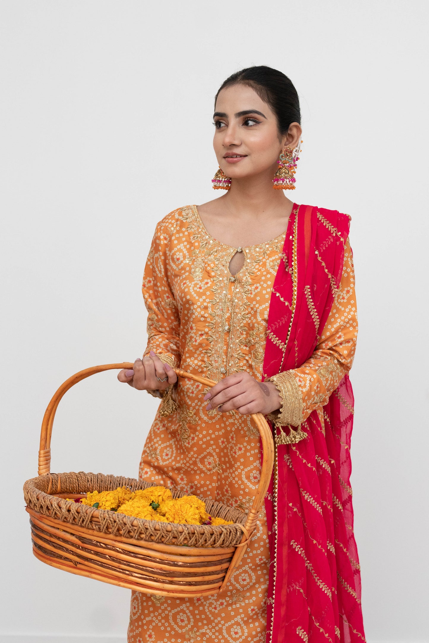 Color: dress Orangish Yellow duppatta color shocking pink.