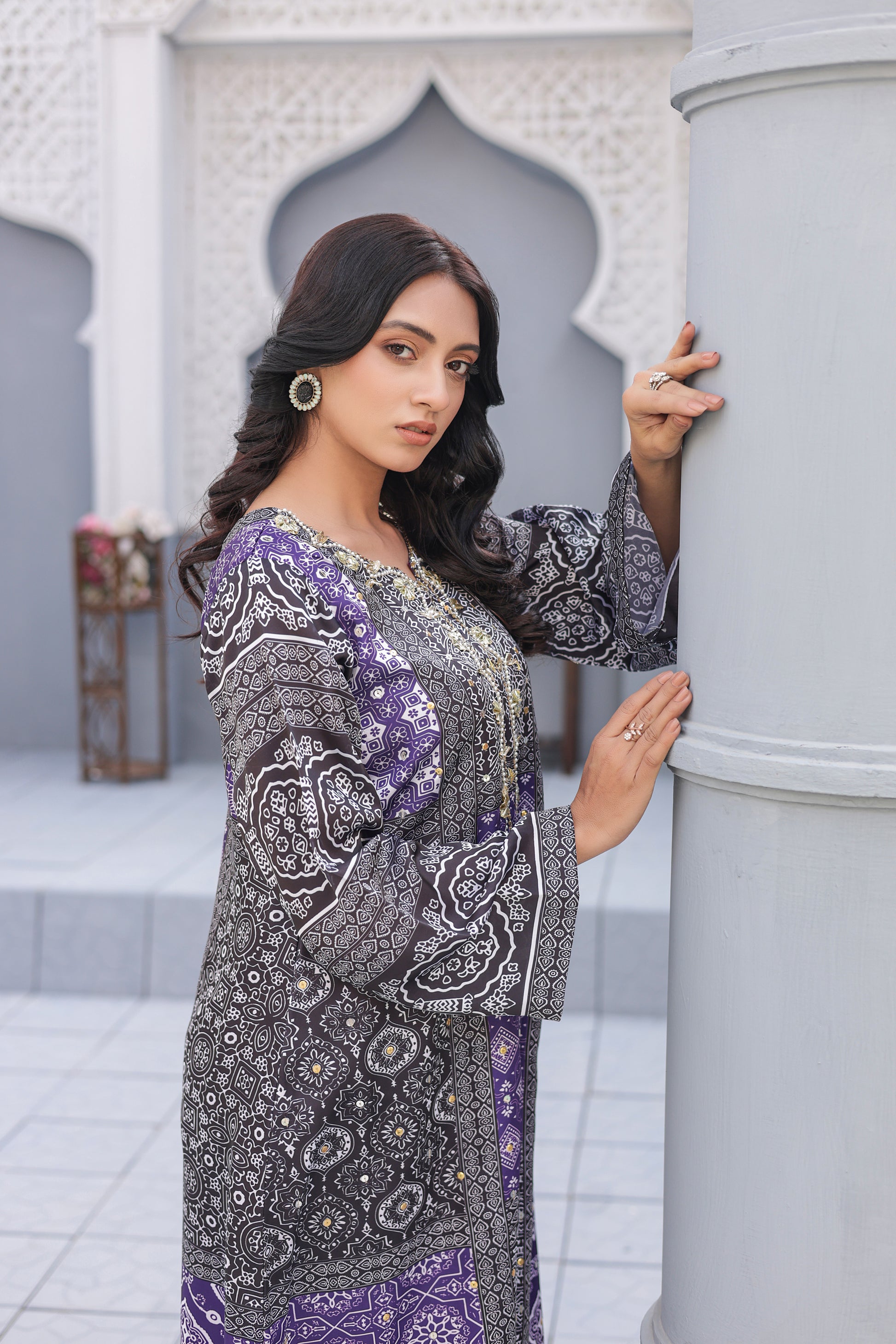 Exude a sense of regal charm with our Royal Purple Ajrak Kaftan. This stunning addition to the collection features deep violet and plum hues rendered on luxurious Shamois silk. The intricate digital print pays homage to centuries-old block-printing traditions, while the hand-worked neckline provides a high-end, artisanal finish.