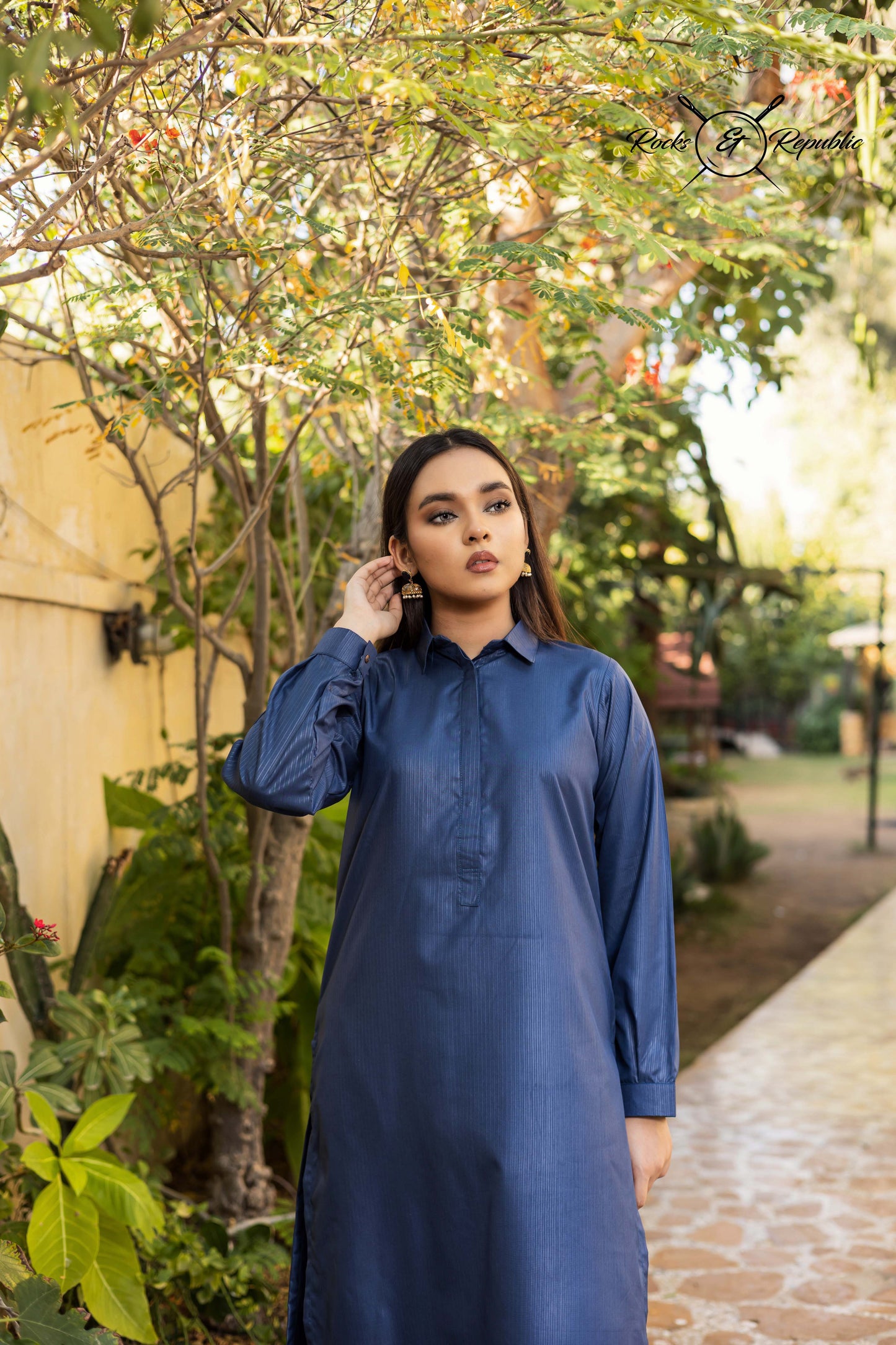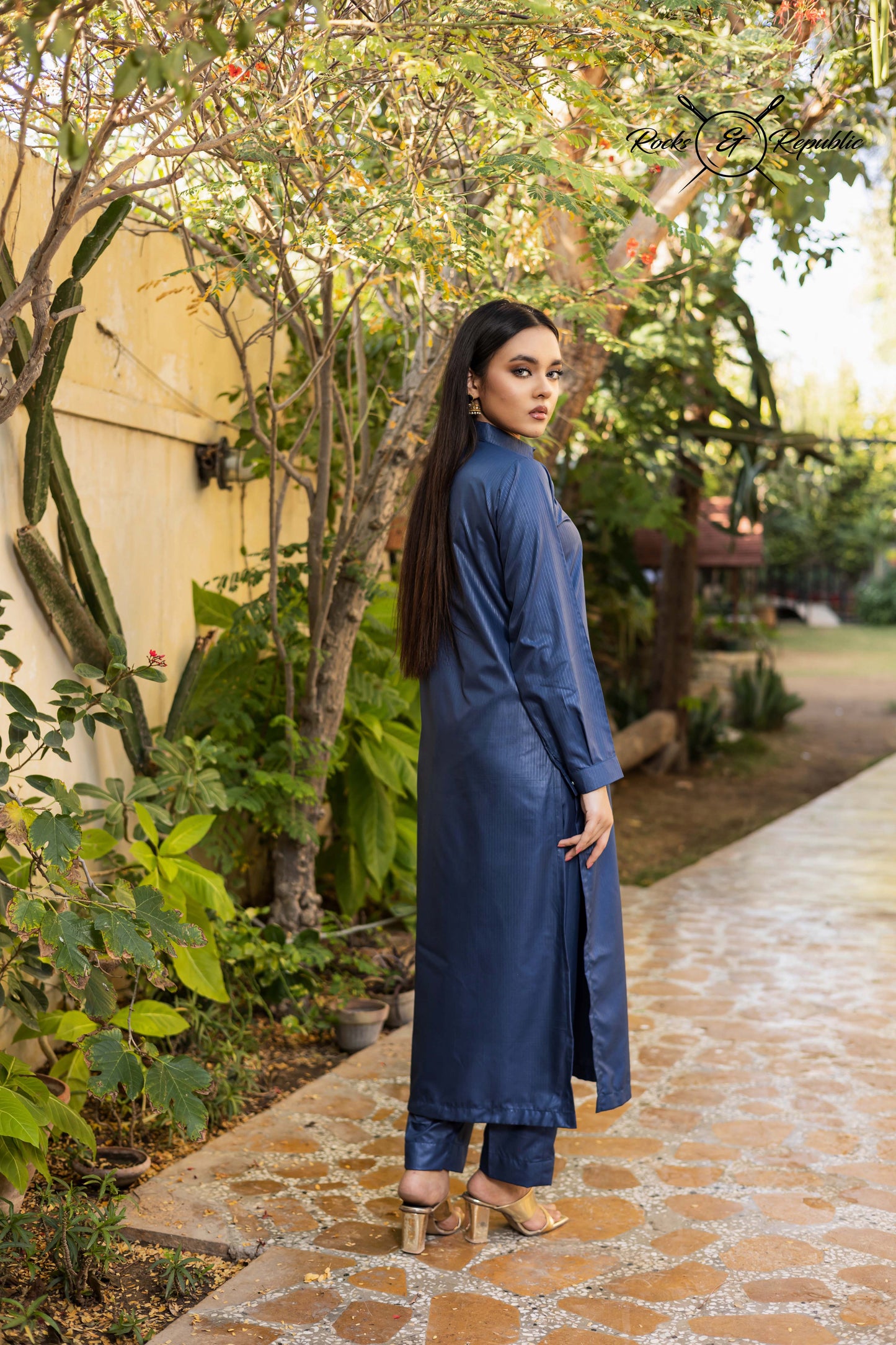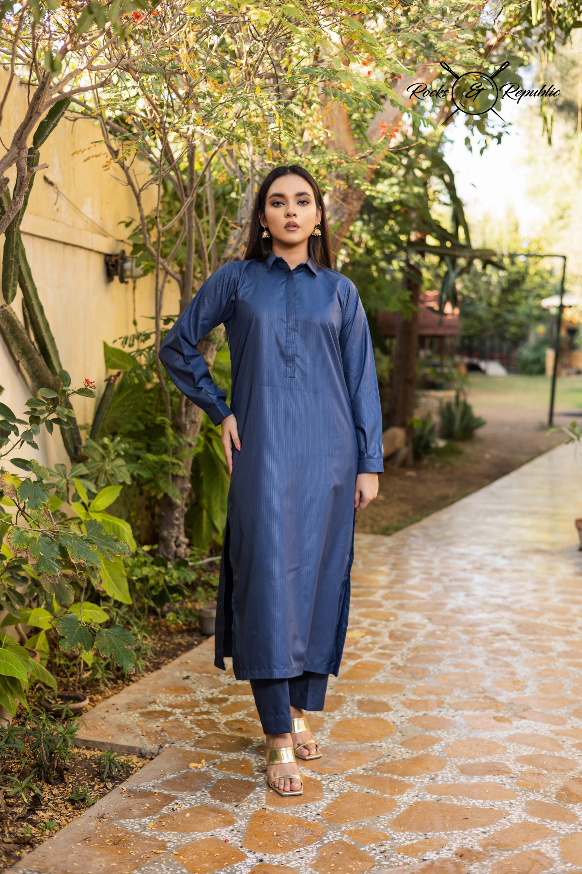 ut : 2 pieces Co-ord Set , with long length with kurta with Shirt Collar neckline enclosed with metallic buttons . with Straight pants .Sleeves are straight ends with half inch cuff.