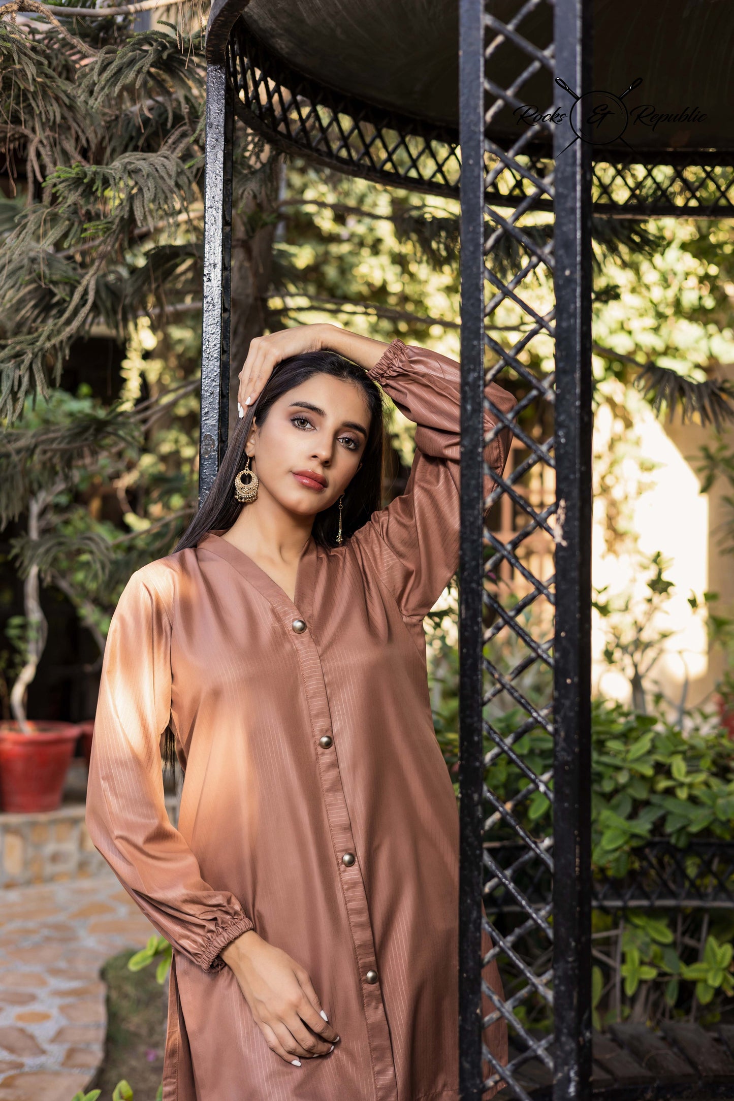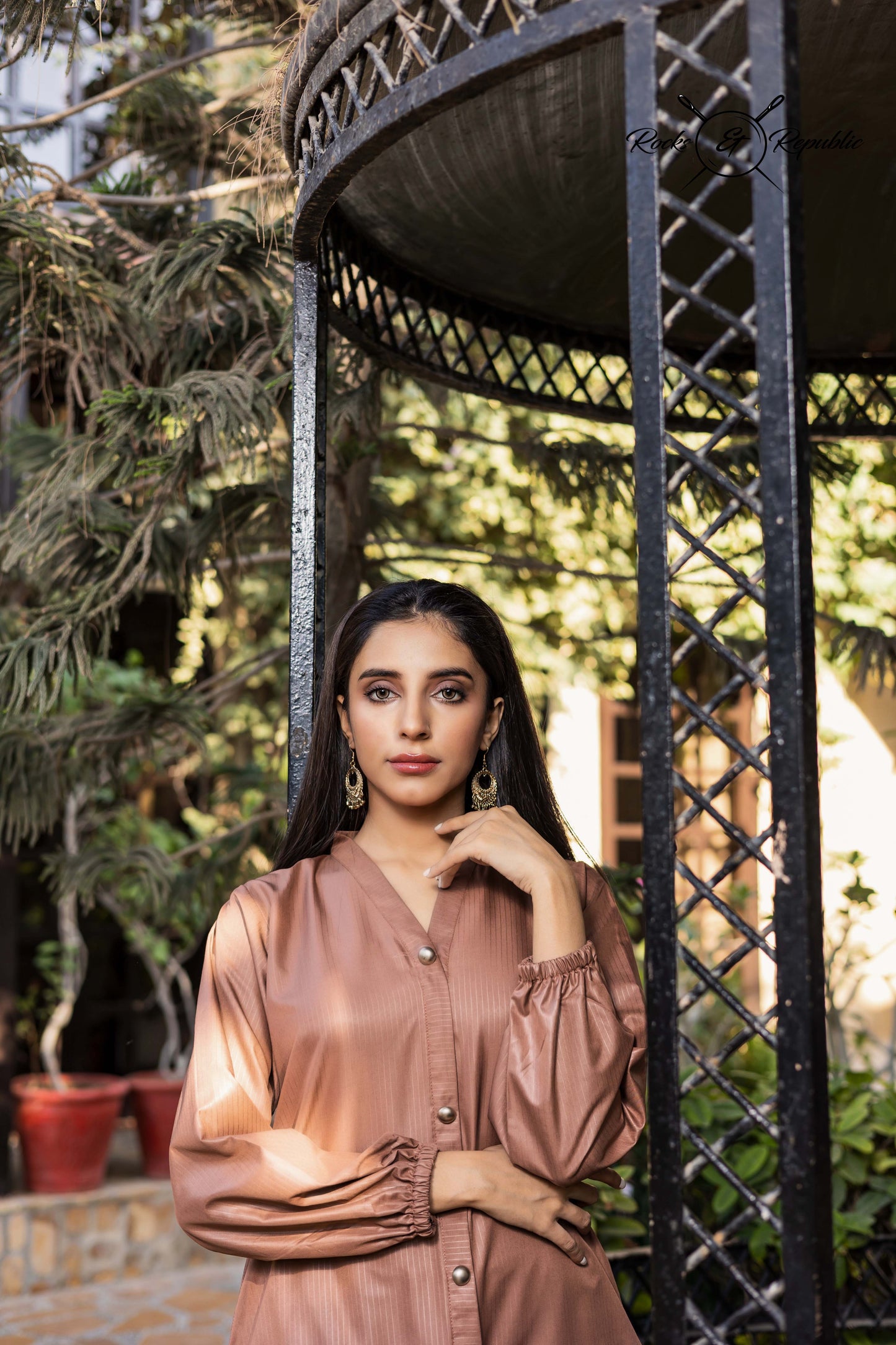 Cut : 2 pieces blended Cotton short length button down style shirt with a V neck style , Enclosed with beautiful metal toned buttons. With Straight Wide pants. Sleeves with elastic on ends with gathers .