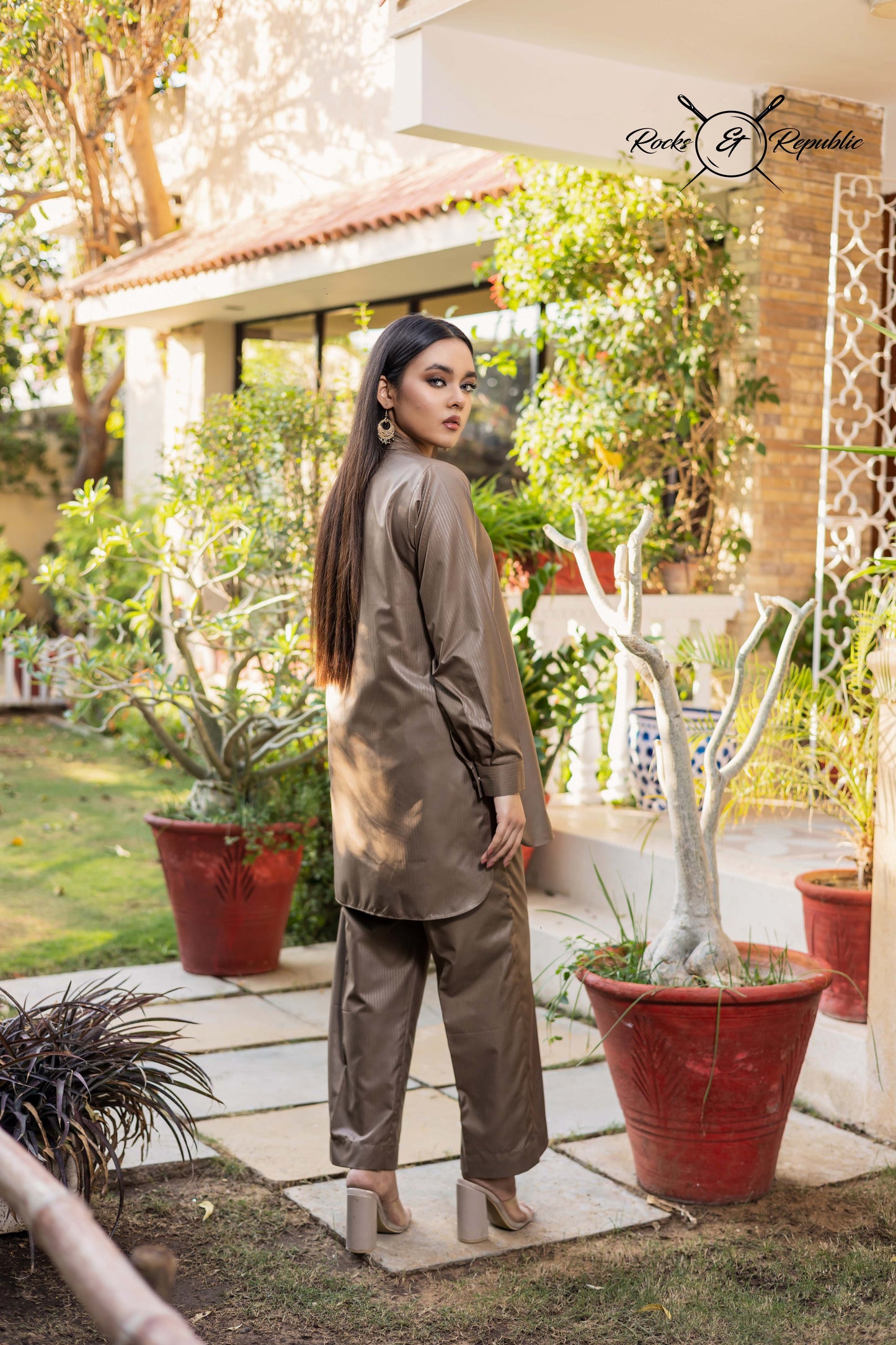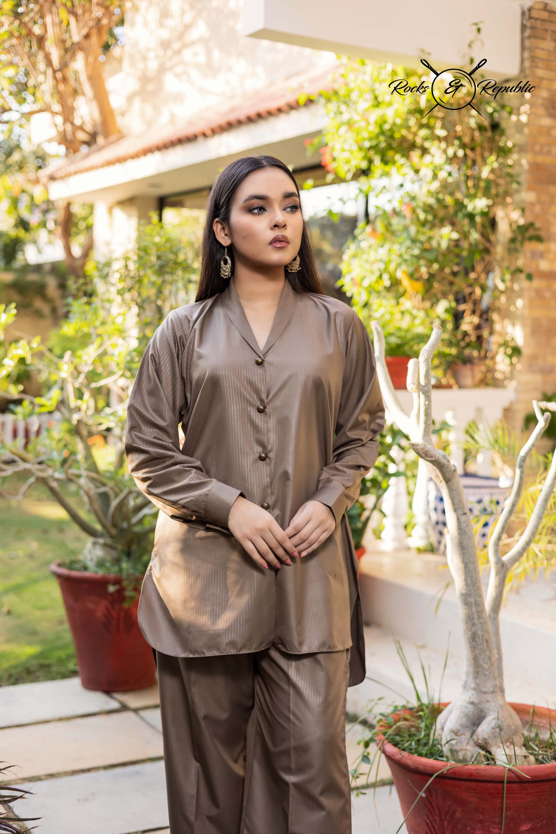 Cut : 2 pieces blended Cotton short length button down style shirt with a V neck style , Enclosed with beautiful metal toned buttons. With Straight Wide pants. Sleeves with elastic on ends with gathers .