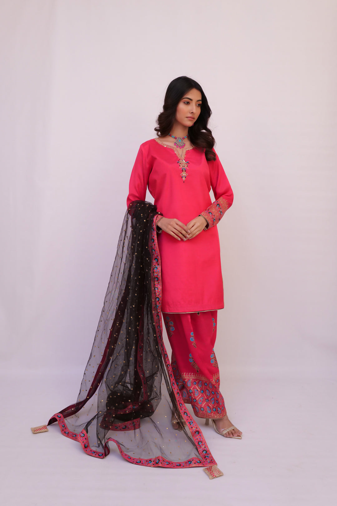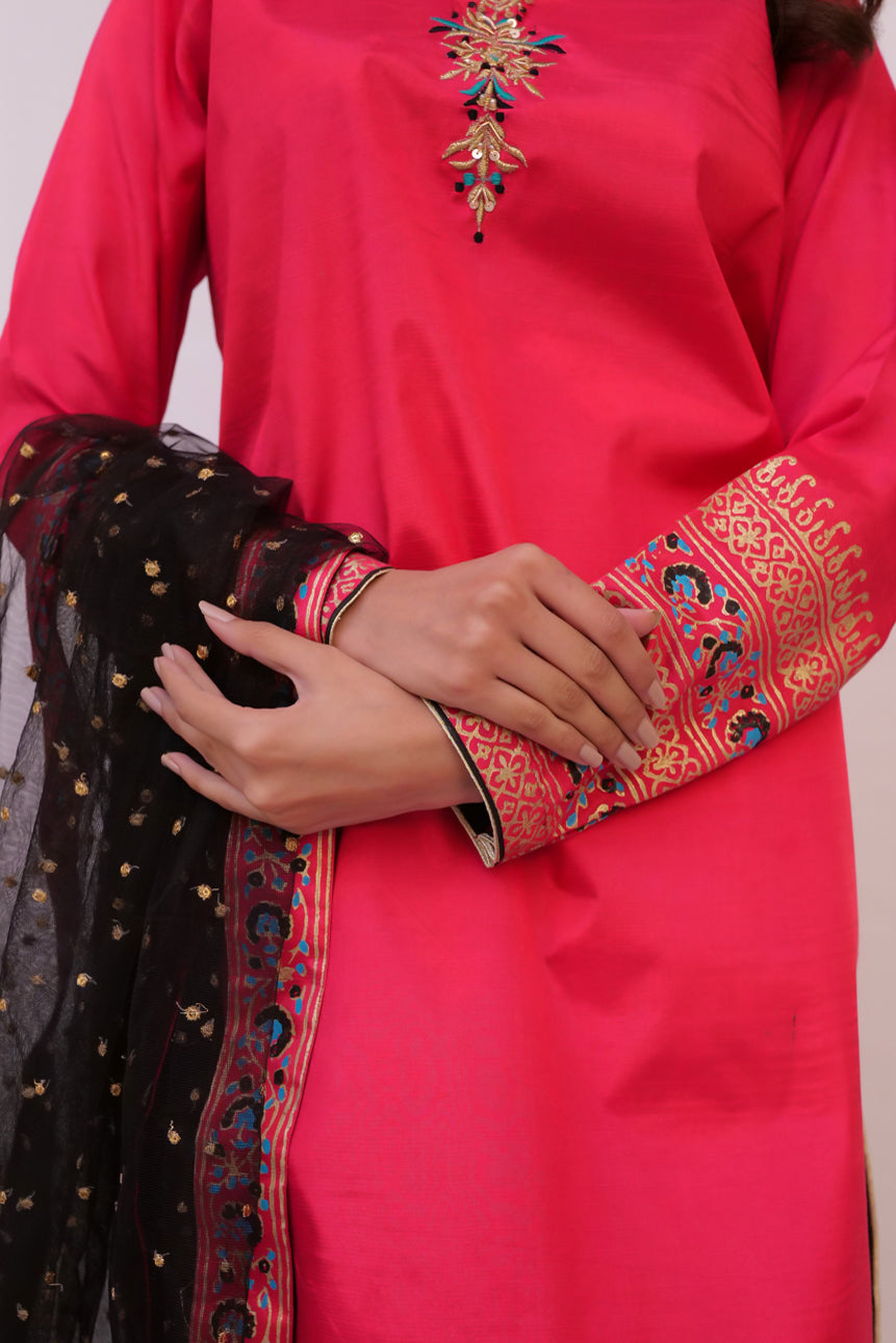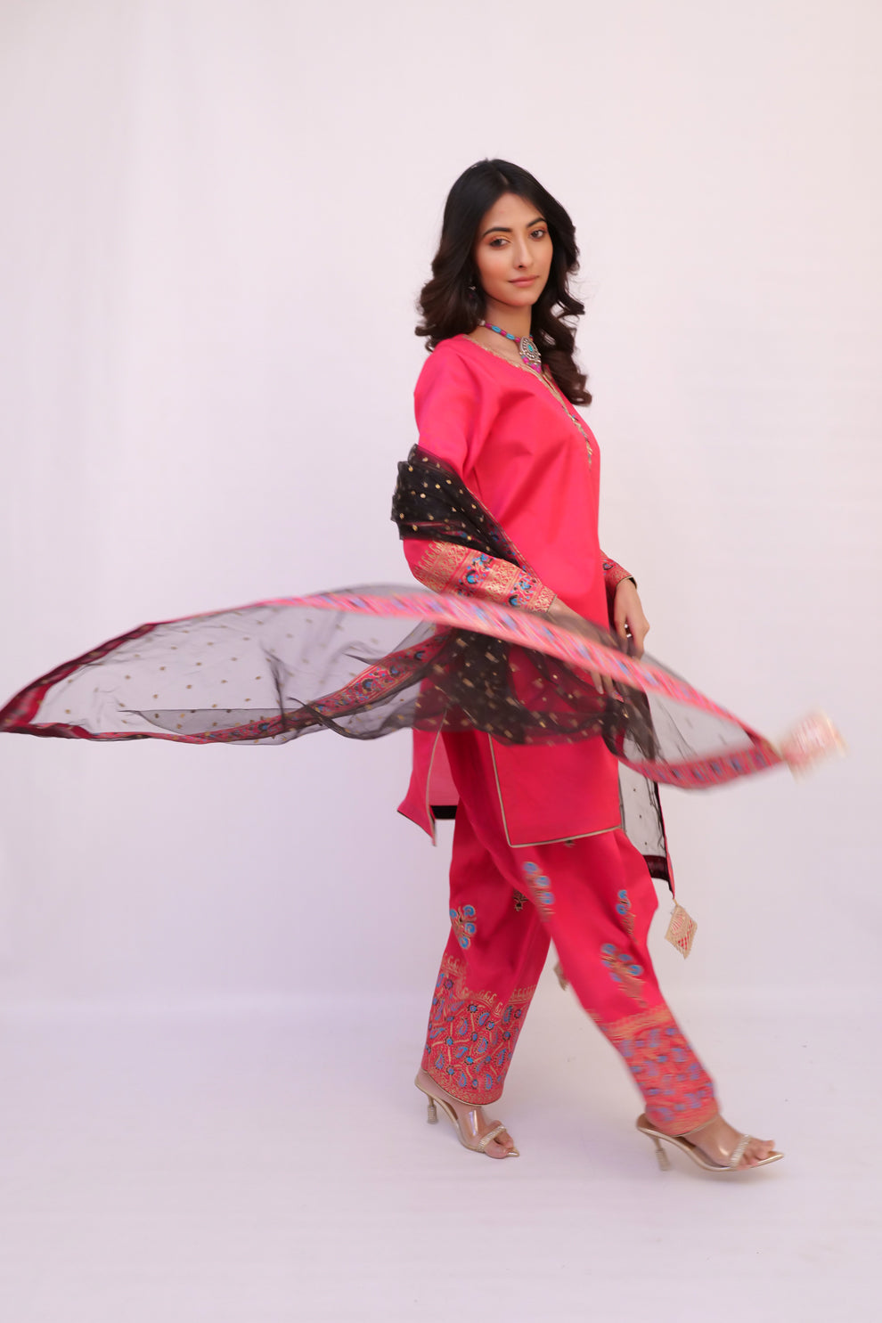Chaap Tilak Farsi Shalwar Hand Blocked (Fushia Pink )