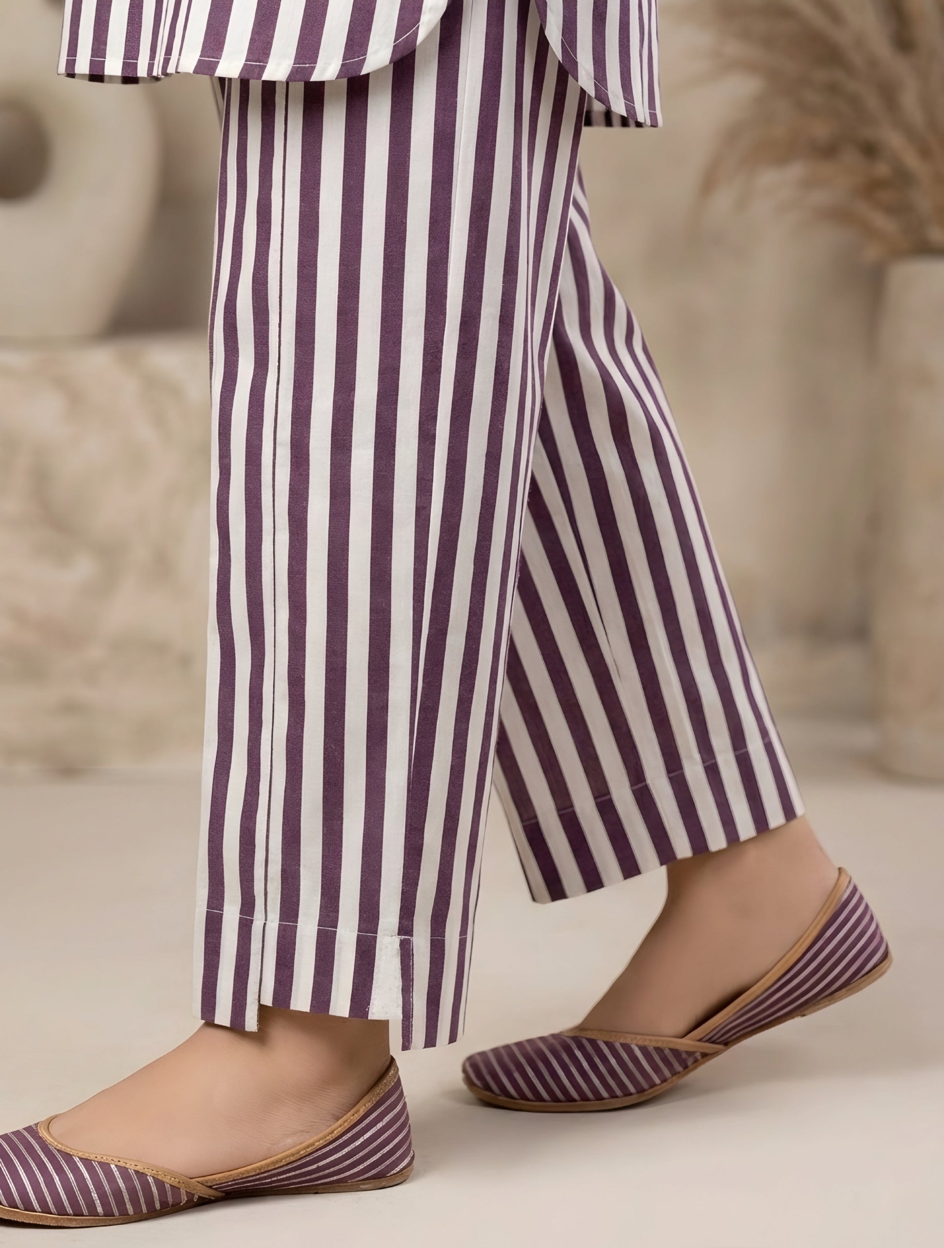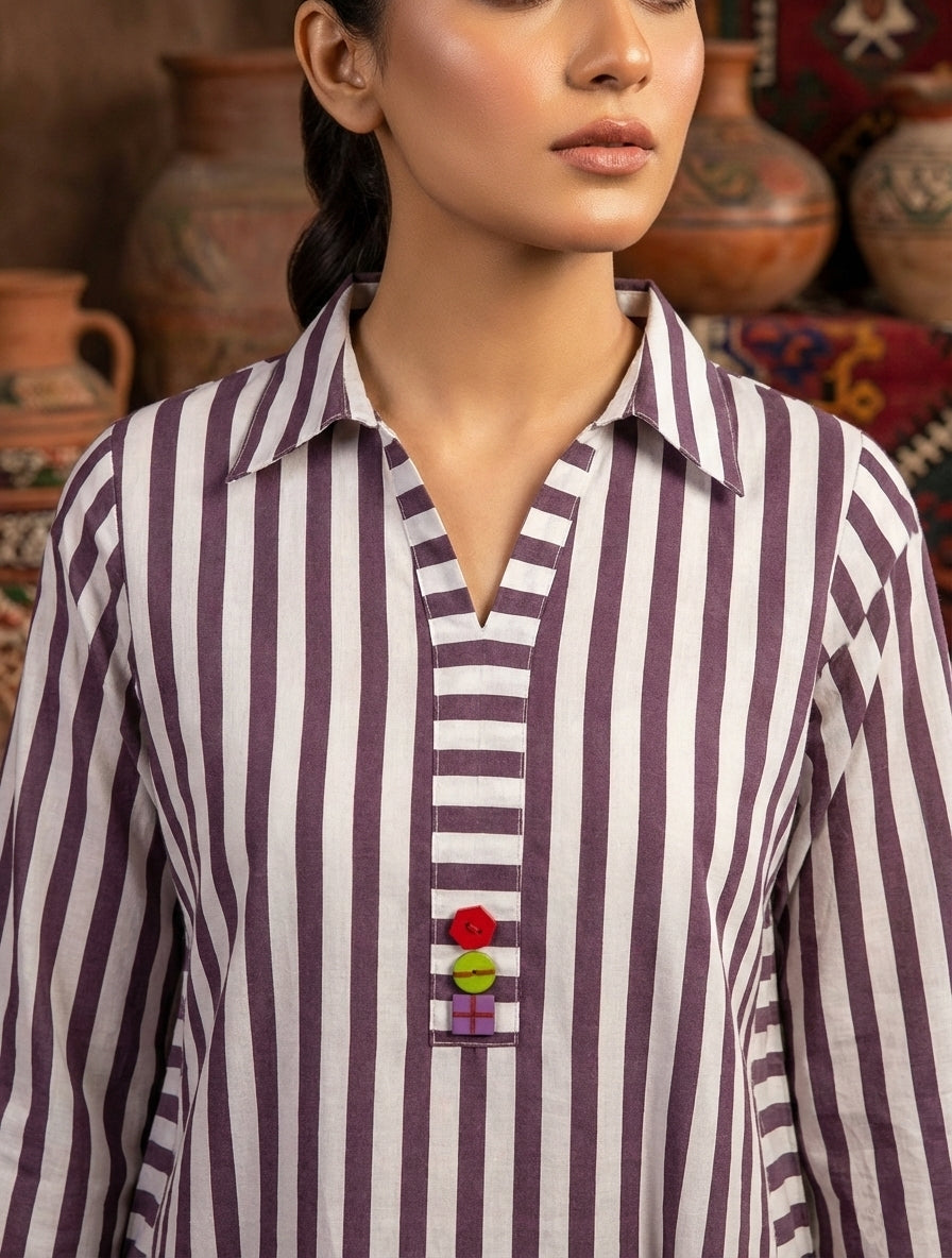 2 pieces co-ord set. Soft Cotton Fabric. Having 3 quarter sleeves . Wide Straight pants. Thigh length shirt. Button details.