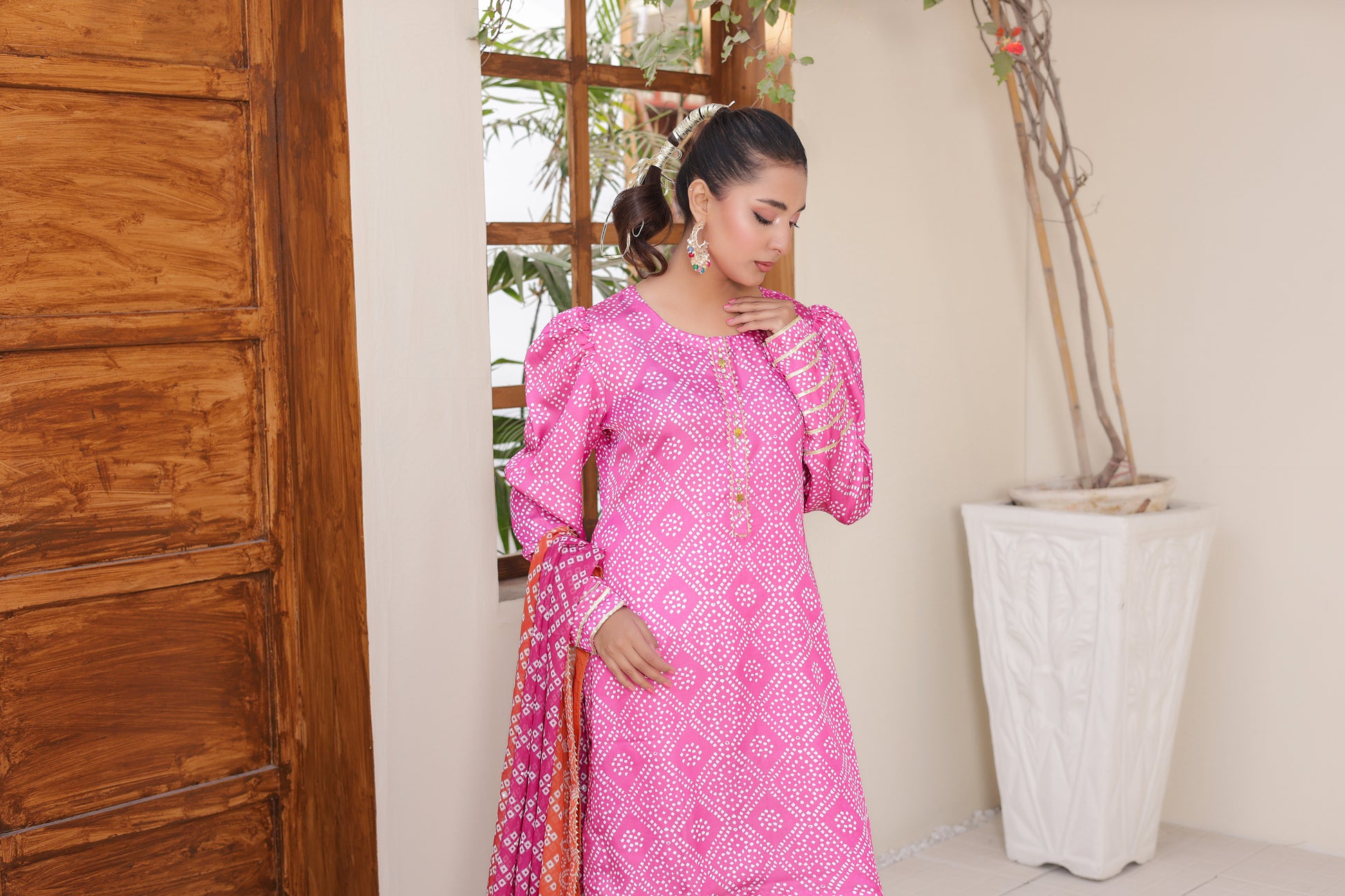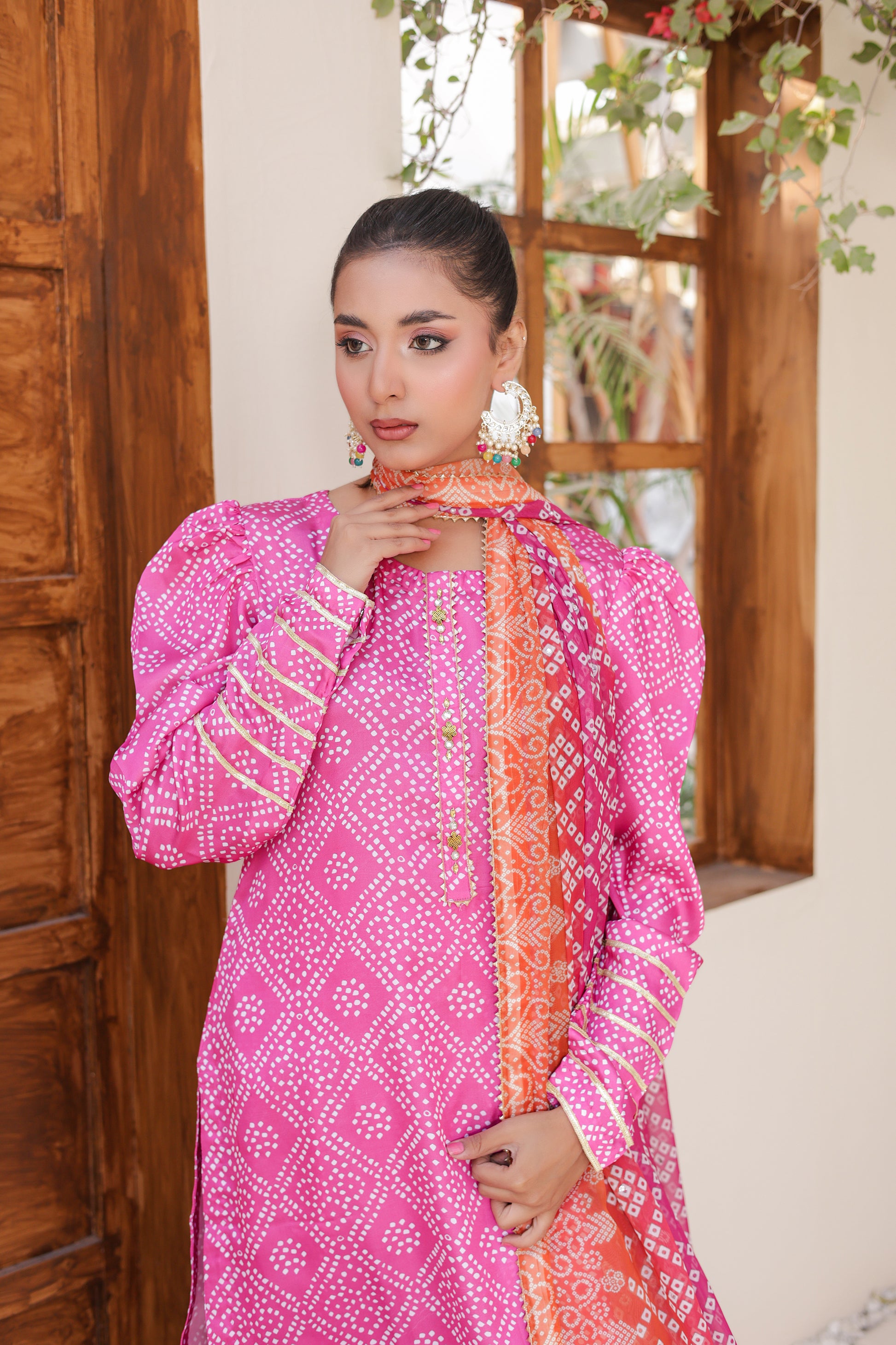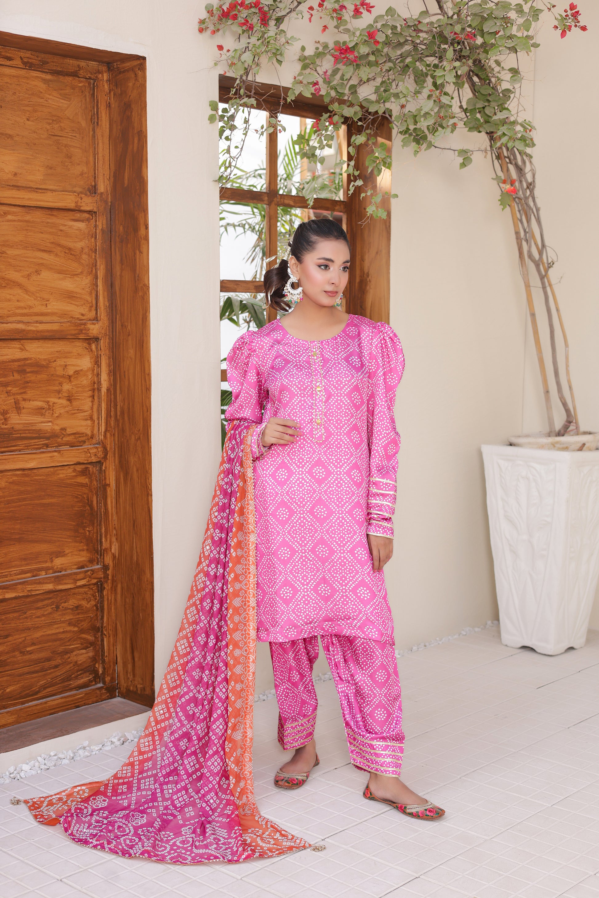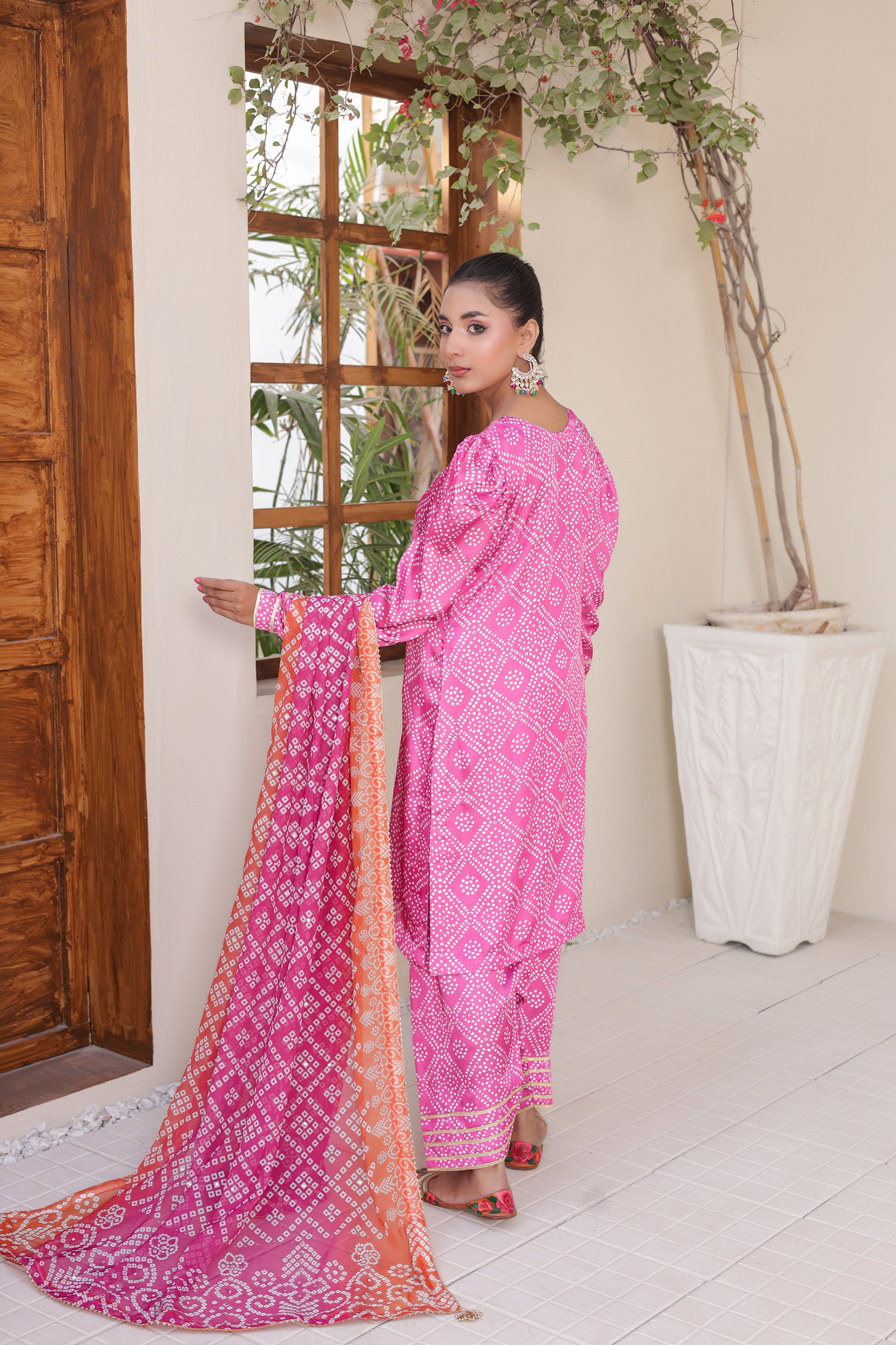 Vibrant Contrast Dupatta: Accompanied by a digitally printed Poly Silk dupatta in a warm orange and pink gradient, providing a stunning visual pop.