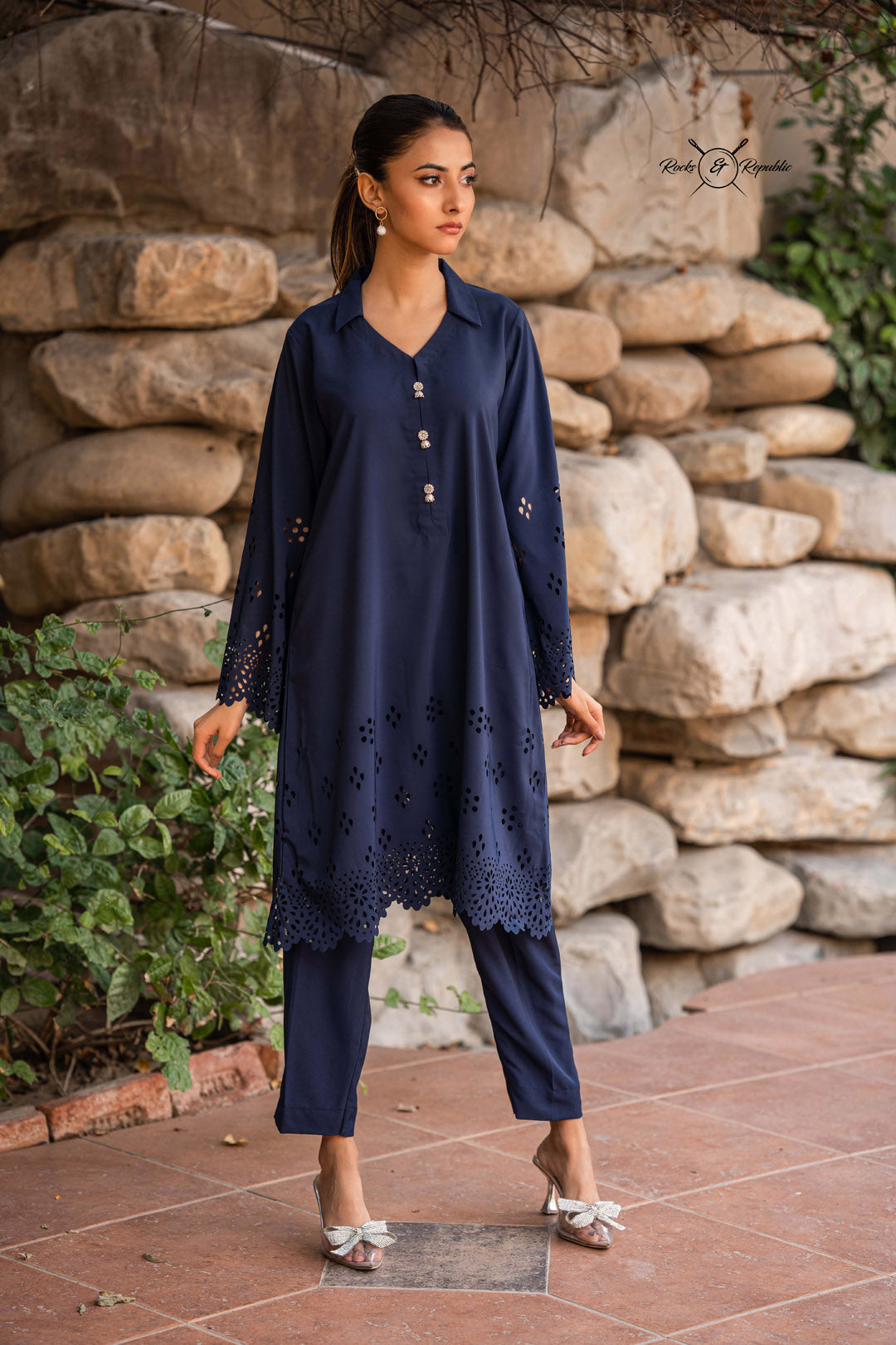 Cut : 2 pieces Co-ord Set. With a Medium length shirt along with cut work borders on sleeves and on daman . Neckline is broad Shirt collar neck style . Sleeves being slightly bell shaped. Pants are straight and plain .