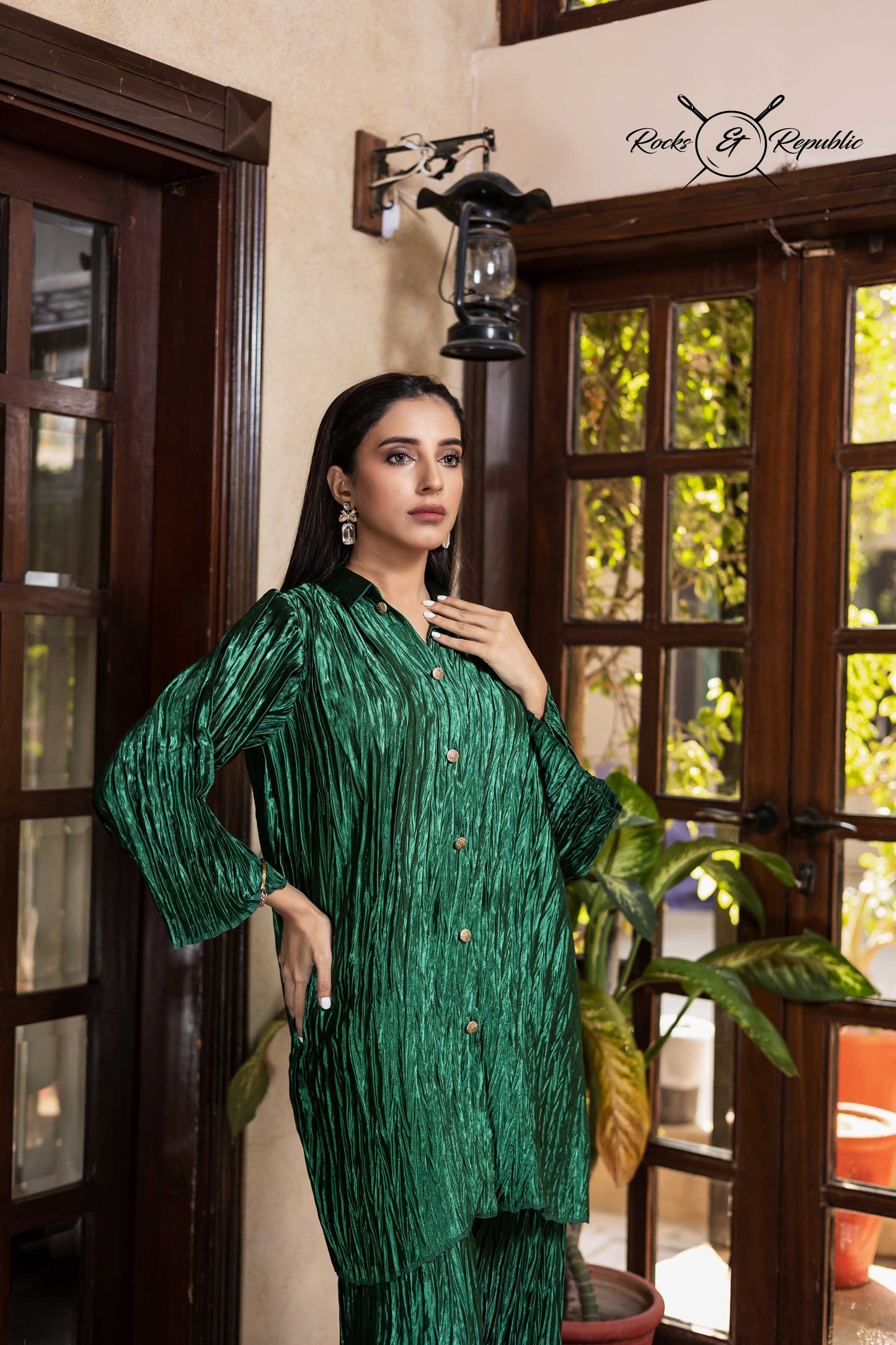 Stitched in button down shirt style with wide pants with Golden Buttons .
